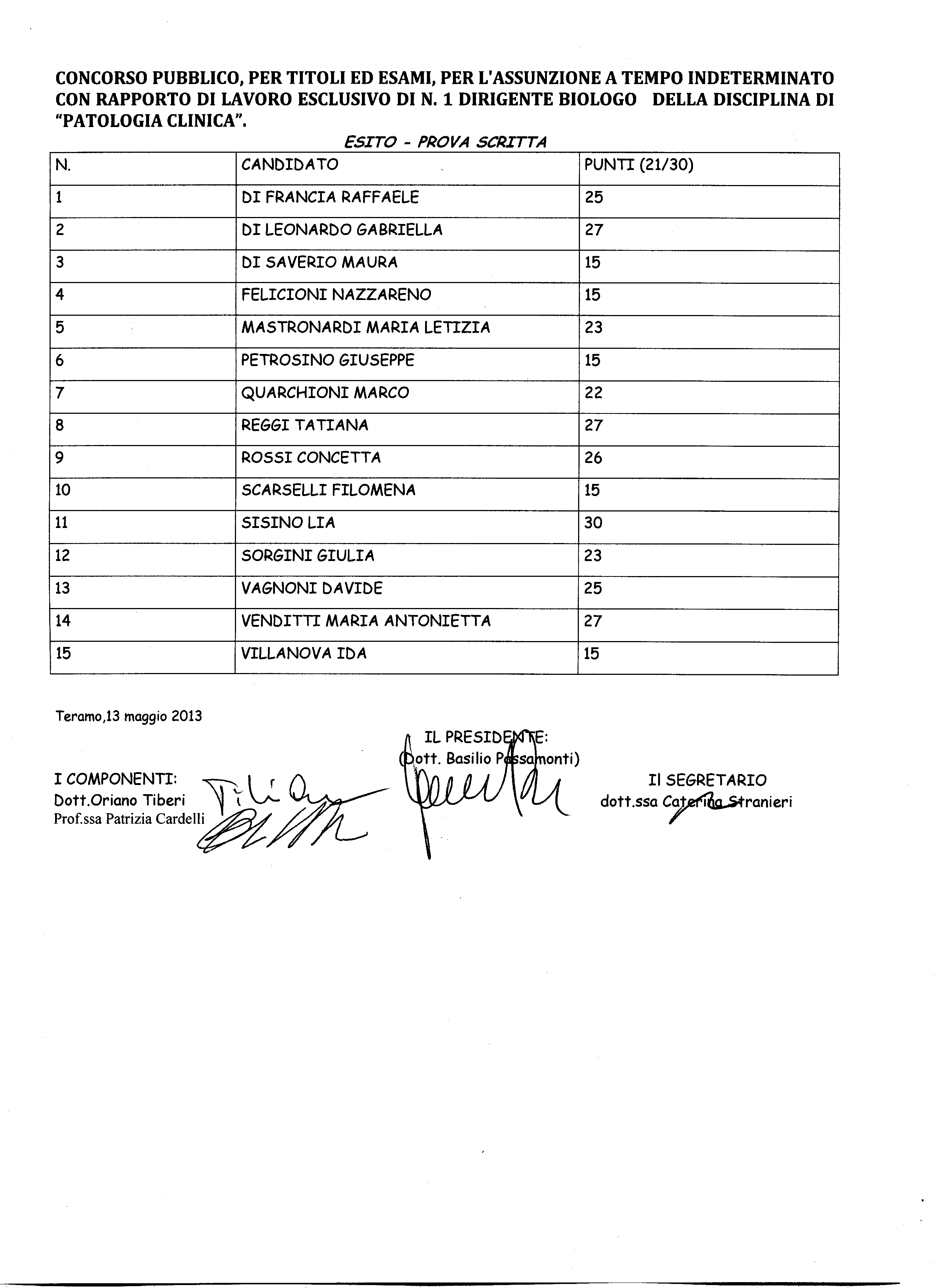 ESITO PROVA SCRITTA – Concorso pubblico , per titoli ed esami, per l’assunzione a tempo indeterminato con rapporto di lavoro esclusivo di n. 1 Dirigente Biologo della disciplina di “Patologia Clinica”.