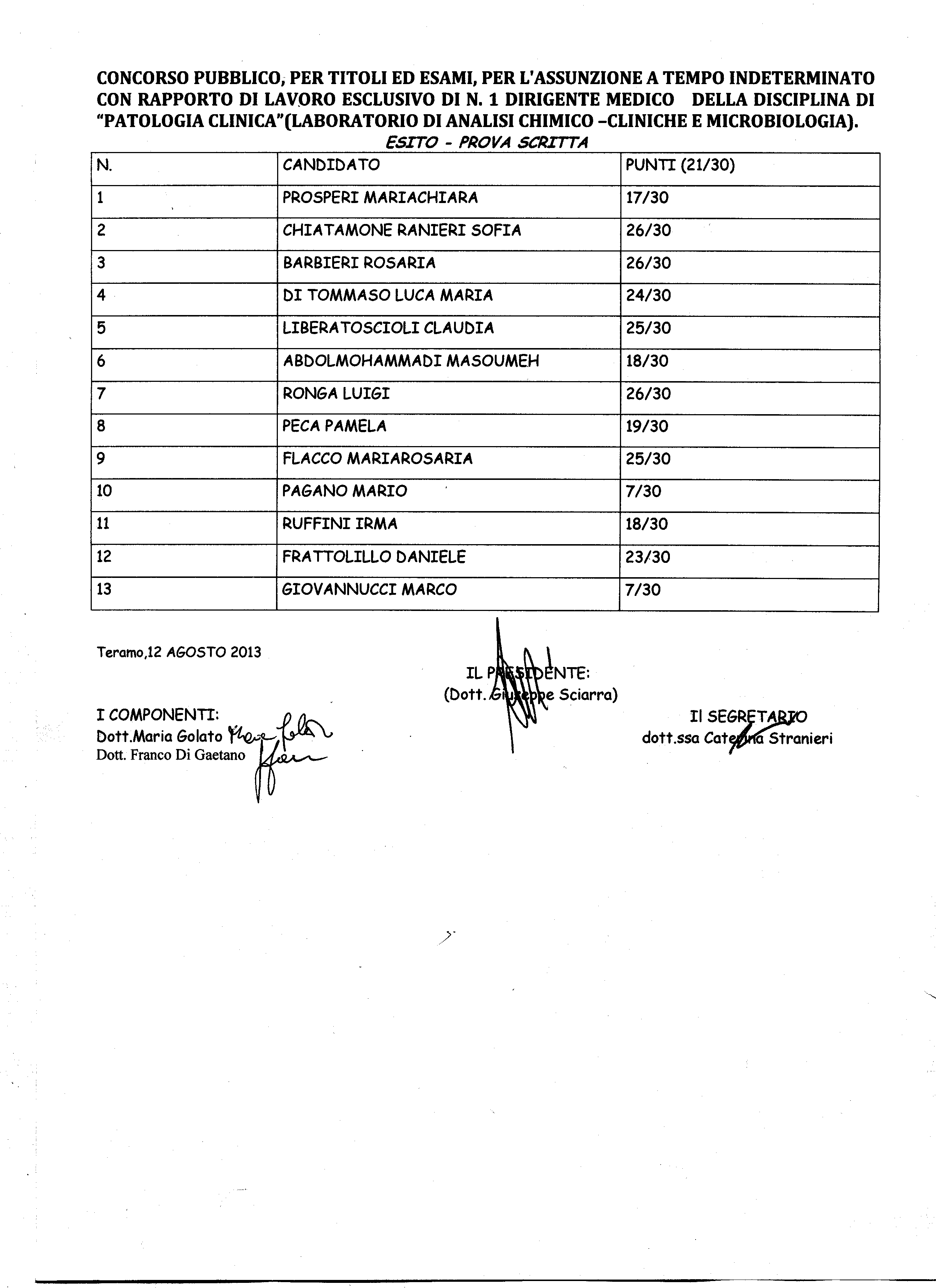 ESITO PROVA SCRITTA – Concorso pubblico, per titoli ed esami, per l’assunzione a tempo indeterminato con rapporto di lavoro esclusivo di n. 1 dirigente medico della disciplina di “Patologia Clinica (Laboratorio di analisi chimico-cliniche e microbiologia)”