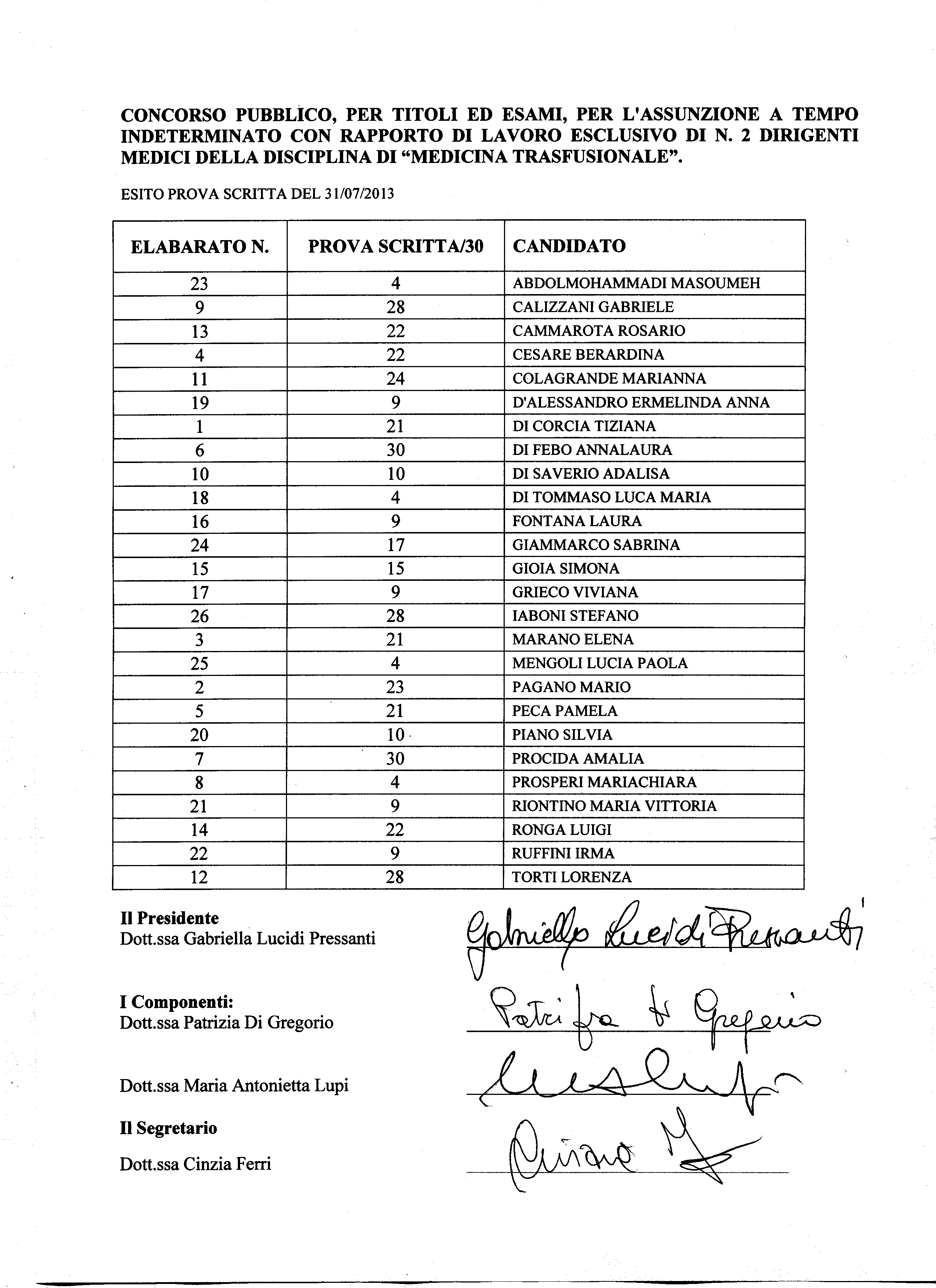 ESITO PROVA SCRITTA – Concorso pubblico, per titoli ed esami, per l’assunzione a tempo indeterminato con rapporto di lavoro esclusivo di n. 2 dirigenti medici della disciplina di “Medicina Trasfusionale”