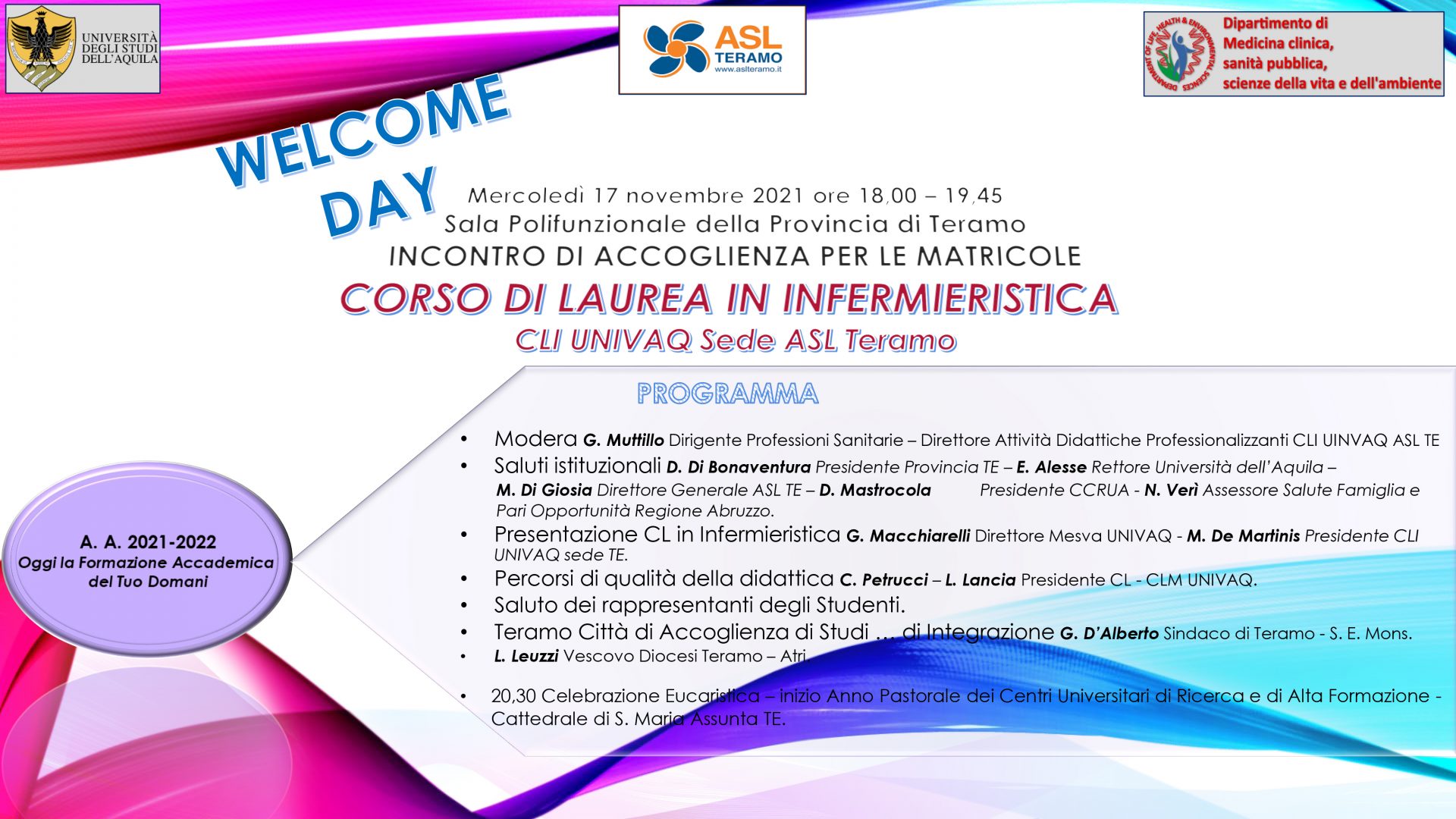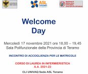 Il Welcome Day  promosso dal Dipartimento di Medicina clinica, sanità pubblica scienze della vita e dell’ambiente dell’Università degli Studi dell’Aquila e dalla Direzione Strategica della ASL di Teramo  ha lo scopo di promuovere l’accoglienza alle 40 nuove matricole del Corso di Laurea in Infermieristica della sede di Teramo. Per gli Studenti sarà l’occasione di condividere i percorsi e gli standard di qualità della didattica del Corso di Laurea in Infermieristica, inoltre sarà evidenziato il ruolo fondamentale dello studente nell’organizzazione del tirocinio clinico della ASL e nella vita accademica, ma sarà anche l’occasione di conoscere meglio la città e le opportunità offerte dal contesto territoriale.